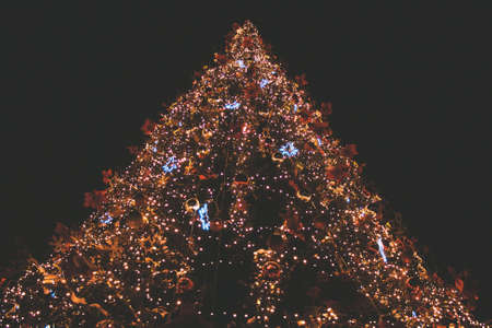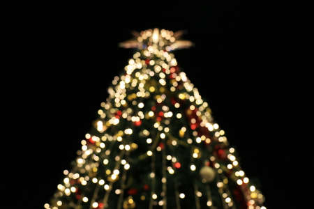 Blurred Christmas tree decoration background with night lights, Christmas holiday celebration, Christmas trees, a new European winter