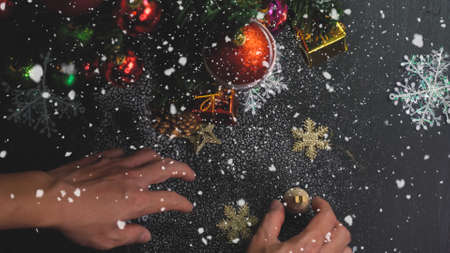 Greeting Season concept.hand setting of ornaments on a Christmas tree with decorative light