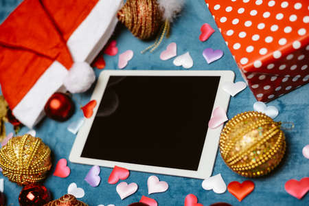 Festive blurry background with white blank tablet mobile computer display and Christmas toys. Mock up top view closeup image of joyful time and technology