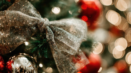 A detailed close-up of a Christmas tree, featuring a large, glittery bow and red baubles, with bokeh lights in the background.