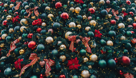 A festive and detailed view of a Christmas tree adorned with various ornaments, including red, gold, and teal baubles, along with decorative bows.