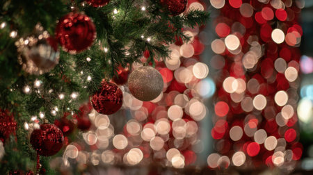 A festive and cozy close-up of a Christmas tree adorned with red ornaments and twinkling lights, with a soft bokeh background.