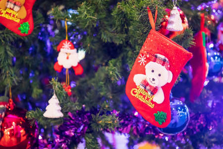 Decorated Christmas socks baubles on fir tree New Year holidays background