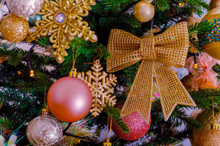 Gold sparkling bow, pink ball, snowflakes on the Christmas tree. Happy New Year. Shallow depth of field. Toned image.