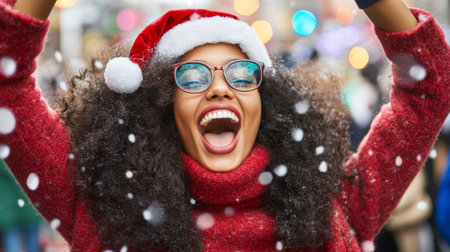 Joyful woman in glasses and Santa hat, hands raised in celebration.