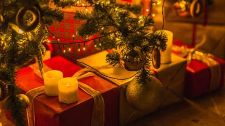 Christmas and New Year interior decoration. Green tree decorated with toys, gifts, present boxes, candles. Xmas tree. Cozy christmas atmosphere