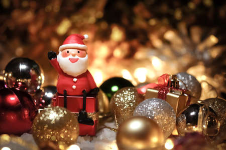 Merry Christmas with Santa and toy ball Detail , Merry Christmas and happy New Year and Family happiness festival on red bokeh background.