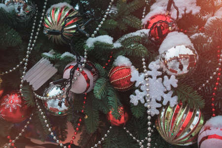 Close up of part of Christmas tree with different christmas toys and garland on street in evening city. Coniferous tree with decorative decorations to create festive mood