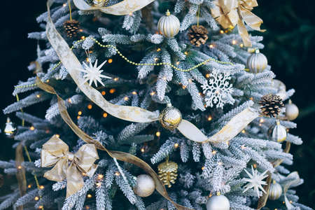 Close up of big Christmas tree with different christmas toys and decorative adornments on street. Coniferous tree with garland, beads and stars to create festive mood during holiday celebration.