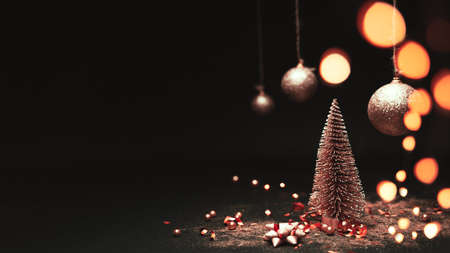 Christmas tree with bokeh and red ribbon, balls and glitter gold confetti, with copy space. Xmas present, Christmas banner, Horizontal christmas poster, greeting cards, headers, website.