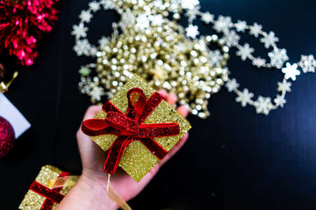 Woman's hands hold christmas decoration. Christmas and New Year holidays background, winter season with Christmas ornaments and blurred lights