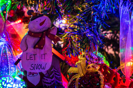 Christmas tree decoration festive background. Various toys and baubles and holiday lights on the tree.