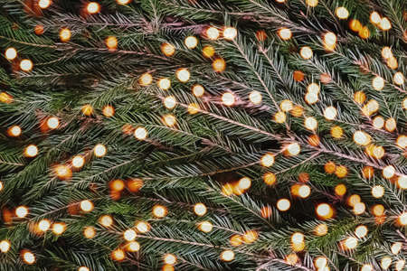 Christmas background with fir branches and blurred lights.
