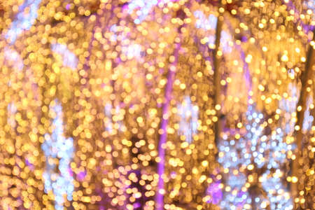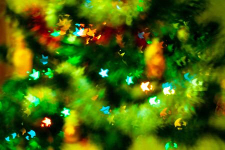 Abstract background of blurred image of the Christmas lights on the Christmas tree with varicolored light spots and patches of light