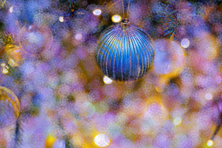 Decorated Christmas tree on blurred varicolored new year's background . Christmas Ornament On Wooden Background With Snowflakes, Greeting card Merry Christmas and Happy New Year .