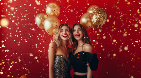 Two glamorous women radiate joy against a vibrant red backdrop, adorned with golden confetti and balloons. Their sparkling outfits and bright smiles capture the essence of celebration, creating an atmosphere filled with excitement and friendship.