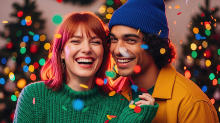 A smiling couple is surrounded by colorful confetti and background lights. The individuals are dressed in bright attire, with a warm and inviting appearance. The scene suggests a celebration or joyful gathering, possibly indoors, with soft lighting enhancing the festive atmosphere. This image is suitable for promotional materials or editorial content.