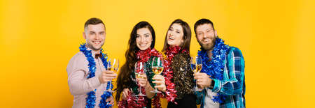 Two guys and two girls in New Year's tinsel and glasses of wine or champagne on a yellow background. New Year's banner with a group of students 20-25s. A group of friends with glasses in their hands look at the camera