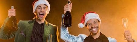 excited interracial men in santa hats holding bottles of champagne and glasses on black