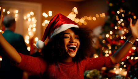 A cheerful young woman wears a Santa hat and smiles against a backdrop of colorful holiday lights, exuding joy and festive spirit.