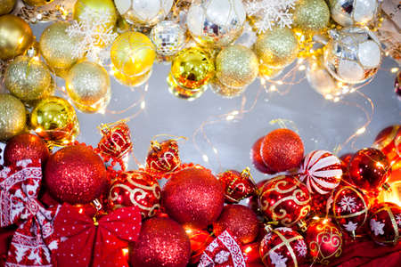 Bright Christmas balls of different sizes on the background of colored paper and garland of lights. Flat lay, free space for text
