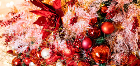 Decorated Christmas tree on blurred background. Christmas decoration. Hanging red balls on pine branches christmas tree garland and ornaments over abstract bokeh background with copy space