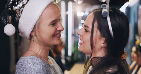 Christmas party, woman and a couple of friends at a holiday lgbt celebration with happiness. Lesbian, smile and gay people celebrate love, social and new year event together feeling relax and happy