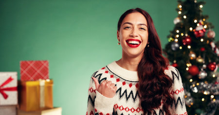 Christmas, happy and portrait of woman in studio with tradition, celebration or festive holiday. Smile, pointing and person from Colombia with excitement by xmas tree and offer on green background.