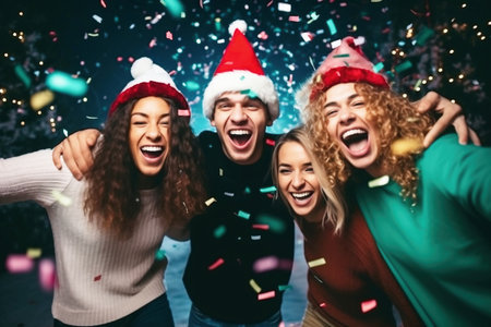 Group of girlfriends in front of the Christmas tree at home. Generative AI