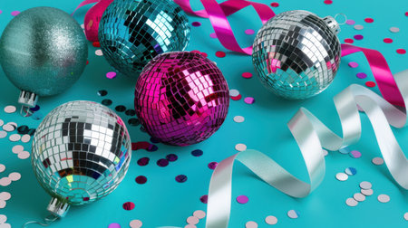 This lively image showcases colorful disco balls and vibrant streamers scattered over a bright blue background, perfect for party themes and celebrations.