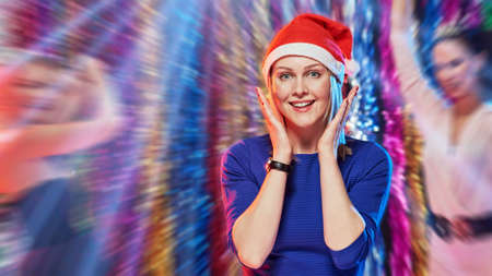 Celebrating New Year. Happy woman wearing santa cap dancing in night club