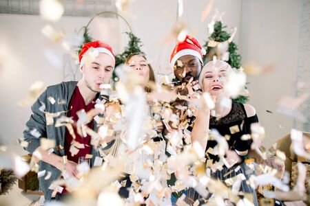 Group of friends laughing on Christmas Party. Two beautiful young couples wearing Santas hats, blowing golden confetti at midnight at New Years Eve party