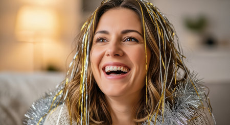 A joyful and diverse group of friends smiles together in a cozy indoor setting decorated for the holiday season, capturing the essence of friendship and celebration.