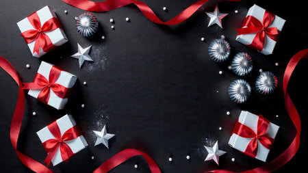 The a festive arrangement of black Christmas gifts adorned with red ribbons and bows. Surrounding the gifts are shiny red and silver ornaments, adding a touch of holiday cheer. The dark background enhances the contrast, making the vibrant colors of the gifts and ornaments stand out prominently. The composition is symmetrical, creating a balanced and visually appealing scene that captures the essence of the holiday season.