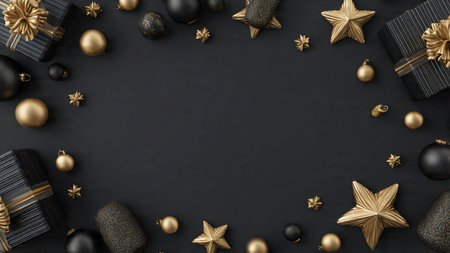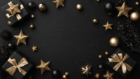 Background with a Christmas balls. Luxury festive black and golden flat lay with a copy space. AI generative