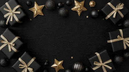 Black Christmas background with gift boxes, golden Xmas decorations, confetti. Creative design greeting card, banner.