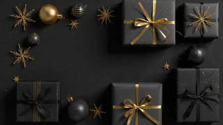 Luxurious matte-black gifts paired with shimmering gold ribbons.