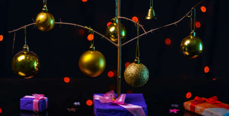 Christmas and New Year background. Festive decorations on the background of a Christmas tree.