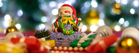 banner with snowman with multicolored Christmas gifts and blur Christmas balls and beads on bokeh background. Christmas background or Christmas card. New Year or Xmas concept. Soft focus