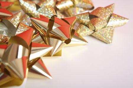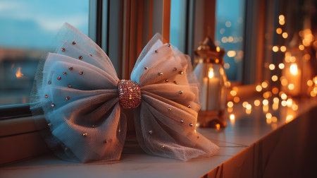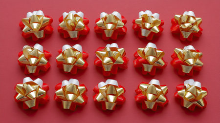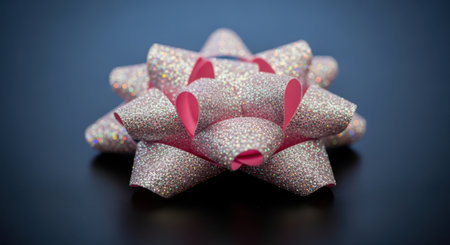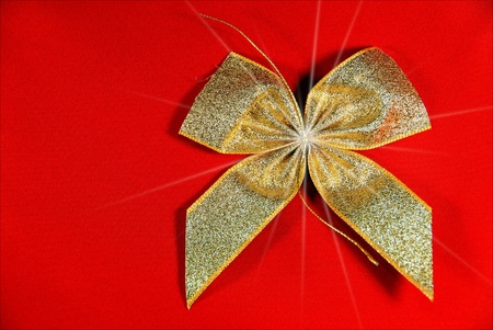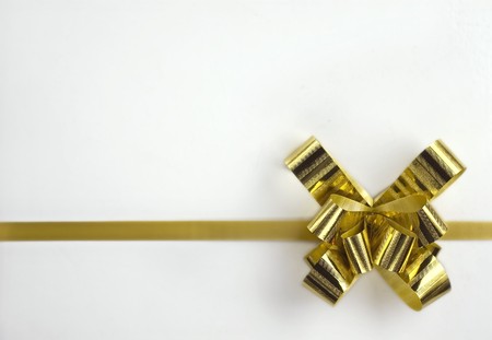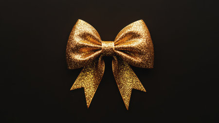 A beautiful golden bow sits atop a gift, illuminated by studio lighting, creating a festive and elegant scene