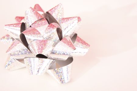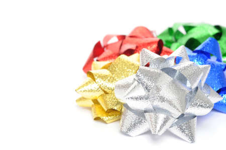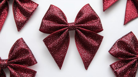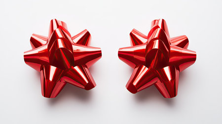 Decorative silver bows on white background. Christmas or birthday backdrop. Celebration and party concept. Flat lay style. Image is with copy space