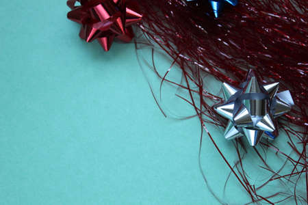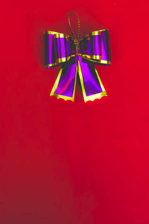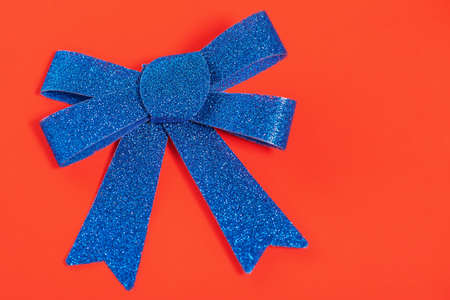 Christmas card, copy space. Christmas composition blue glitter bow on a red background.