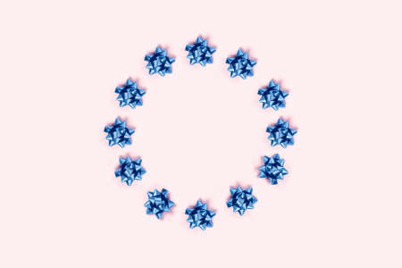 Christmas and new year pattern. Celebration picture. Pink background with blue bright bows. Flat lay, top view, copy space.
