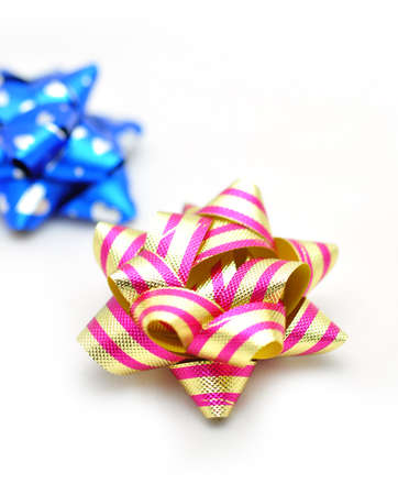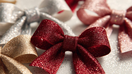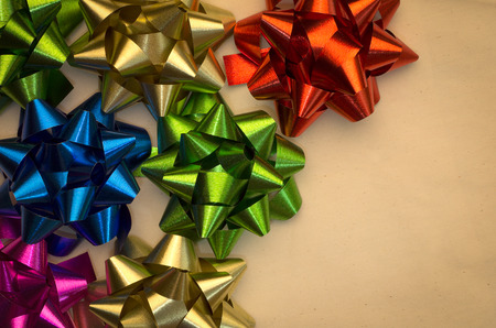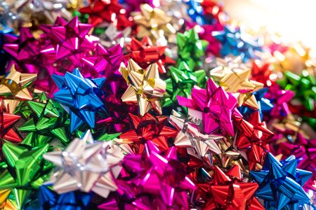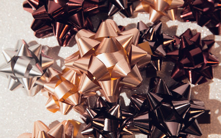 Abstract composition made of decorative bows close up. Festive and party concept. Flat lay. Top view. Selective focus.