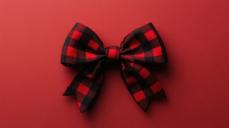 Close view of a bright red bow on a plaid patterned Christmas present.