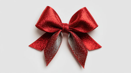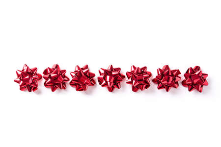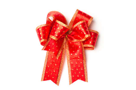 Beautiful red bow gift christmas decoration isolated at border on white background. Xmas ornaments with copy space for text. New year realistic decor design element for celebrate card or flyer