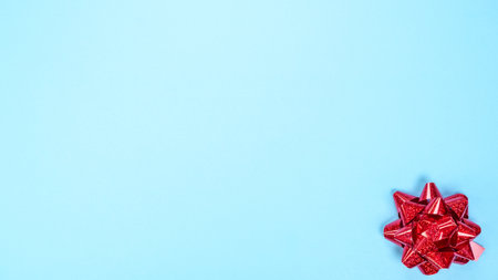 Beautiful Christmas red present ribbon bow over light blue background with space for text. New Year gift. Three colorful bows on blue. Top view New Year Christmas flatlay with decorations.