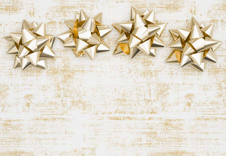 Christmas background with gold bows on grunge white and gold with copy space for your Christmas or gift message