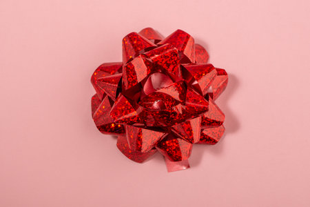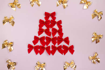 Christmas tree of red bows on a light pink background. The concept of minimalism.