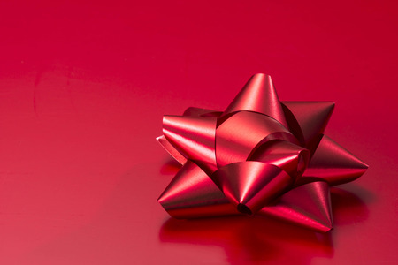 Red Christmas bow with copy space. Beautiful red ribbon bow on white wood with text space. Holiday greeting card.